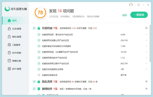 可牛清理大师作为专业的系统清理优化工具,凭借其轻量化设计与高效处理能力,成为众多用户提升电脑性能的首选方案。该软件通过智能算法深度优化系统运行环境,帮助用户快速释放存储空间并拦截恶意干扰,使设备始终保持流畅稳定的工作状态。