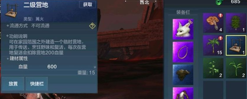 5、制作完成后进入背包界面,长按营地模型进入放置模式,建议选址在资源点与传送阵交汇处,注意避开陡峭地形与水域